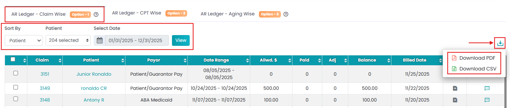 - Click on the 1st tab: AR Ledger - Claim Wise.