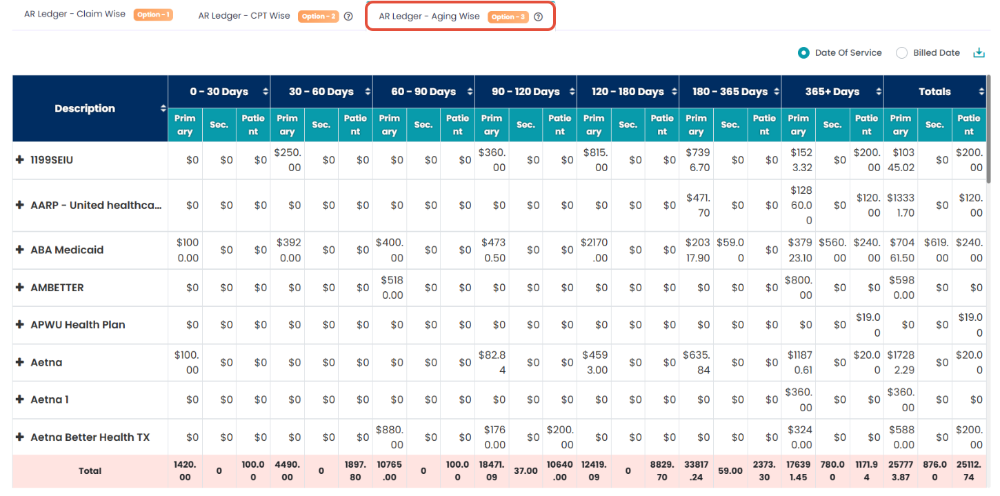 The AR Ledger - Aging Wise module provides a comprehensive report of the dollar amount by insurance and patient through the aging period of the claims.