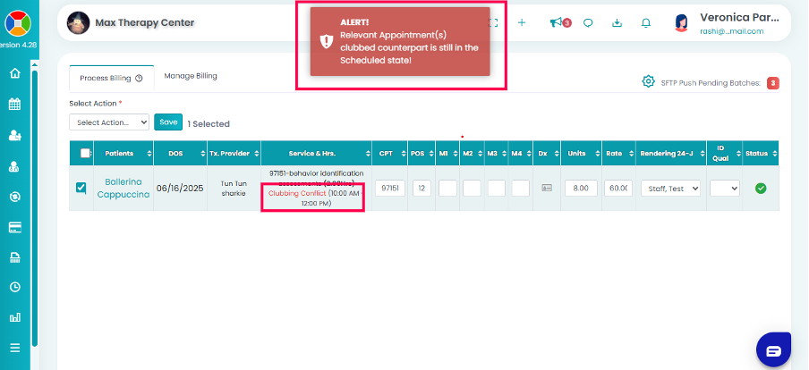 Clubbing validation feature checks for related sessions that should be billed together. If you attempt to process a claim while a related session is still in a “Scheduled” status (i.e., not yet rendered), the system will show an alert.