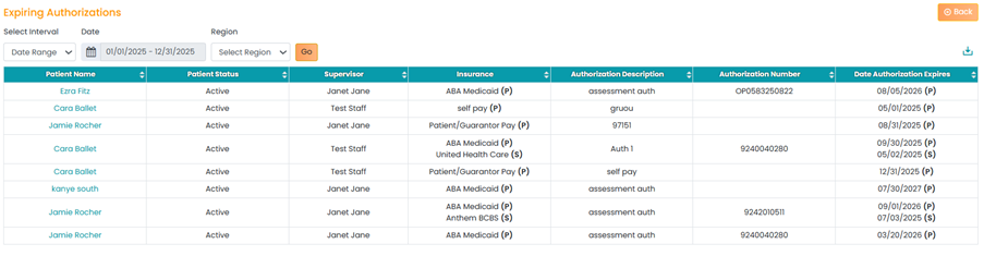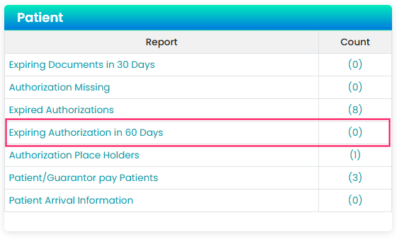 - In the dashboard, access Expiring Authorization Report under the Patients section.
