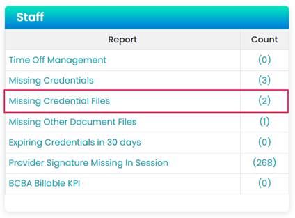 - From the dashboard, navigate to Staff Reports → Missing Credential File.