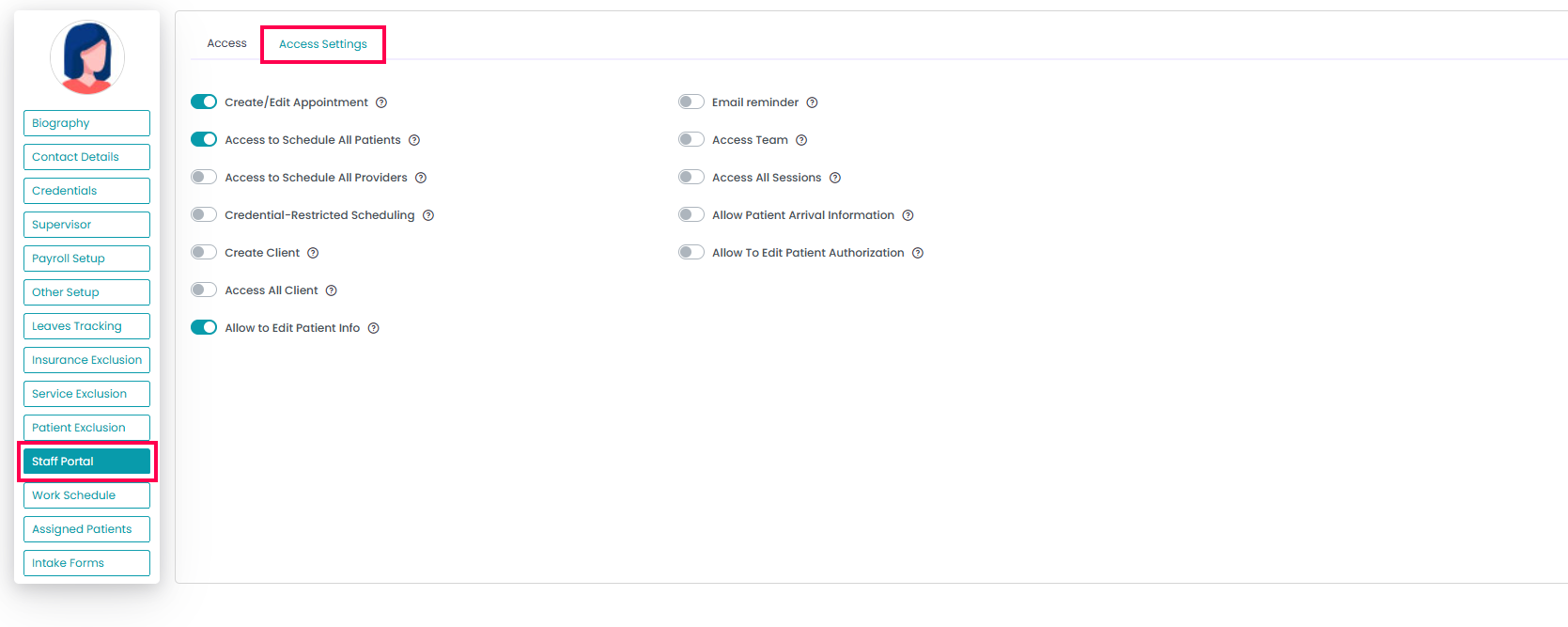 - Click on the Staff Portal tab from the left menu, then open the Access Settings page.