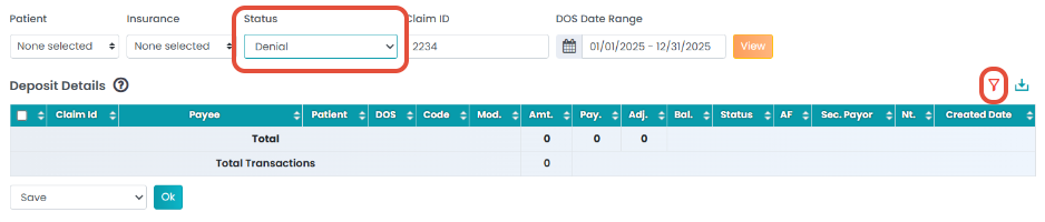 3. Select the filter icon on the right above the Deposit Details table. You will see filters appear.