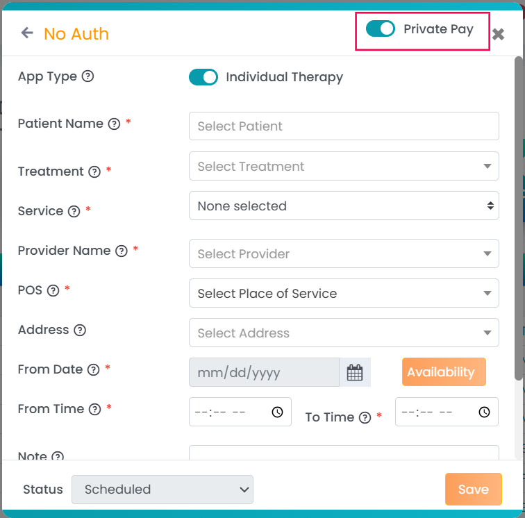 Enable the Private Pay toggle to mark the appointment as Private Pay.