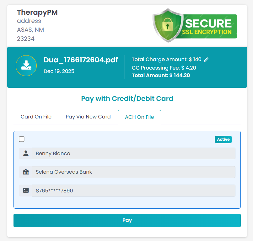 ACH (Automated Clearing House) payments allow client payments to be processed directly from a bank account, eliminating the need to use a credit or debit card.