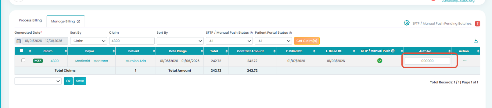 If the Manage Billing authorization field is left blank, the system will attempt to pull the authorization number from the patient’s authorization setup. If that authorization is not configured correctly, the number may not appear as expected on the HCFA.