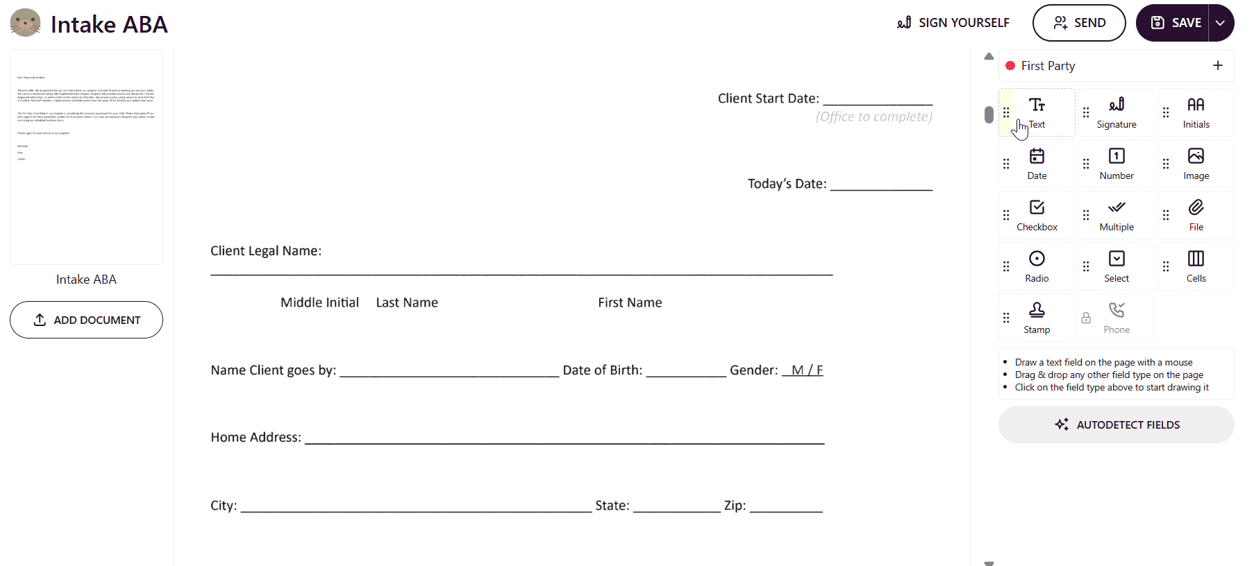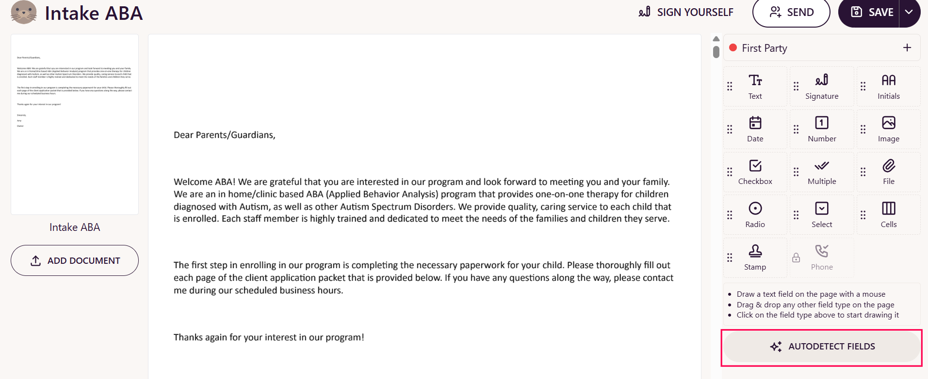 Select the Auto Detect Fields option.This feature automatically identifies and adds all fillable fields from the uploaded document.
