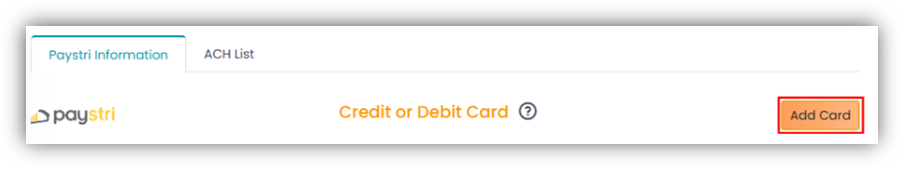 - In the Paystri Information tab on the top-right corner, click the orange Add Card button. A pop-up window will appear.