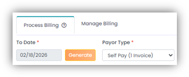 3. Under the Process Billing tab, apply the To Date to generate the billing list. In the Payor Type field, select Self-Pay Invoice.
